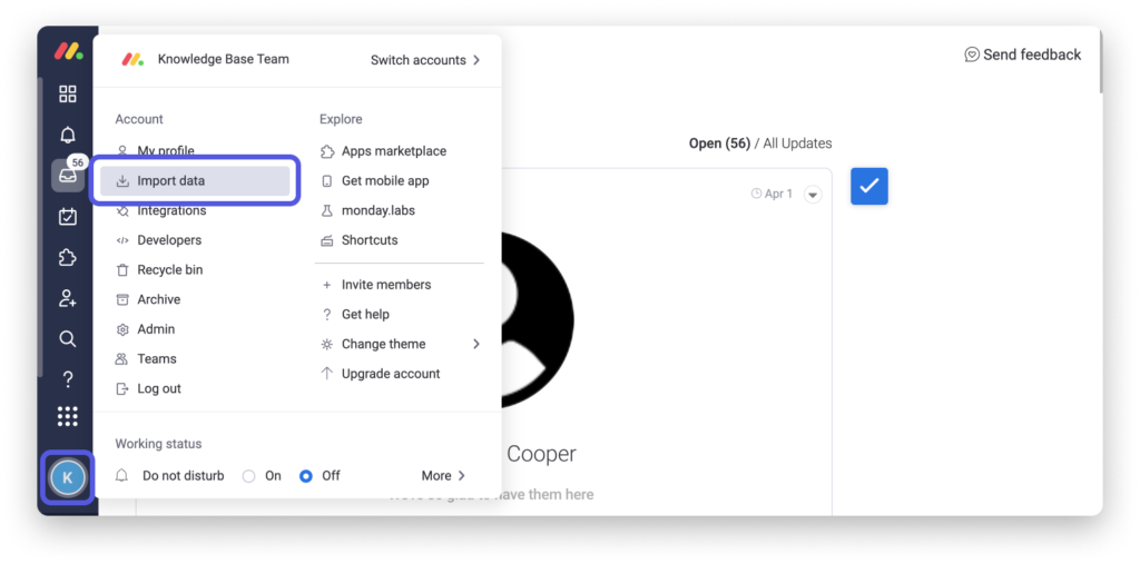Um Ihre Daten zu importieren, klicken Sie auf Ihr Profilbild und wählen Sie "Daten importieren" :
