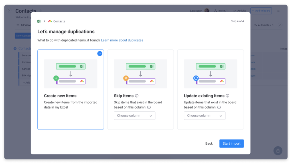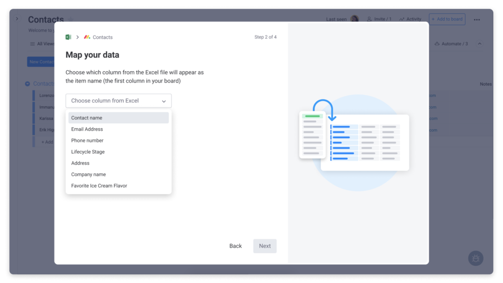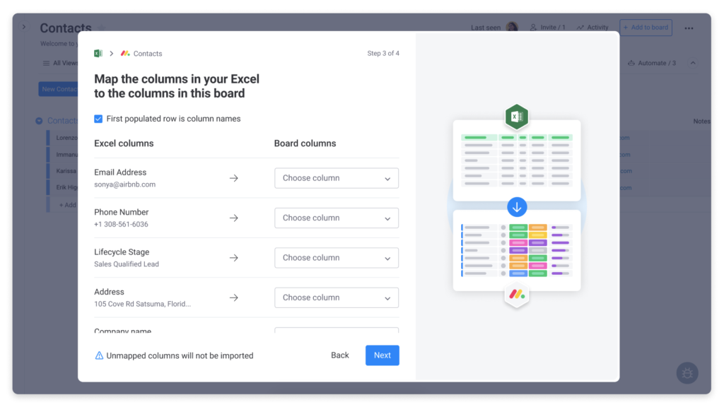 Im nächsten Bildschirm werden Sie aufgefordert, die Spalten Ihres Excel-Dokuments mit den Spalten Ihrer Monday.com-Tabelle abzugleichen. Beispielsweise können Sie sich dafür entscheiden, die E-Mail-Adressen in Ihrem Excel-Dokument mit der Spalte "E-Mail" in Ihrer Monday.com-Tabelle abzugleichen.