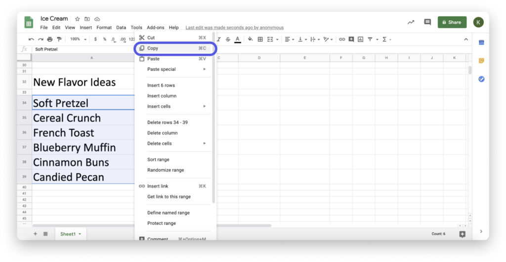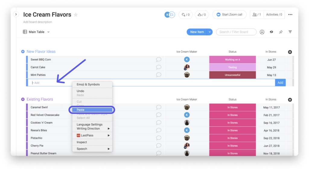 Angenommen, wir haben in einer Excel-Tabelle neue Ideen für Eissorten hinzugefügt und möchten sie in unsere Gruppe "Neue Eissorten" in unserer Tabelle "Eissorten" übertragen. Mit einem einzigen Klick können wir mehrere Elemente kopieren und einfügen von unserer externen Quelle direkt in unsere Elementgruppe.