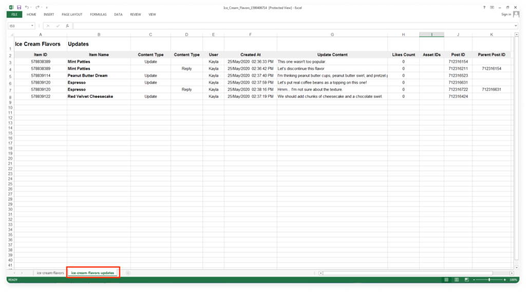 Wenn Sie sich dafür entscheiden, Updates einzubeziehen, sehen Sie die Tabelle in einem Tab und alle Updates und Antworten in einem anderen Tab Ihres Arbeitsblatts, wie unten dargestellt:
