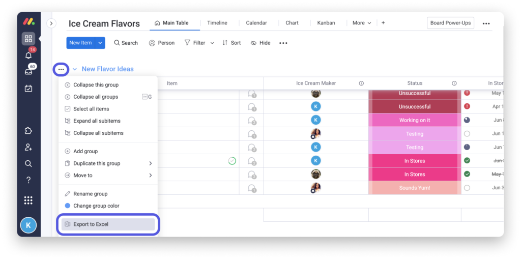 Um eine Gruppe nach Excel zu exportieren, klicken Sie einfach auf das Seitenmenü links neben dem Gruppennamen und wählen dann "Nach Excel exportieren".