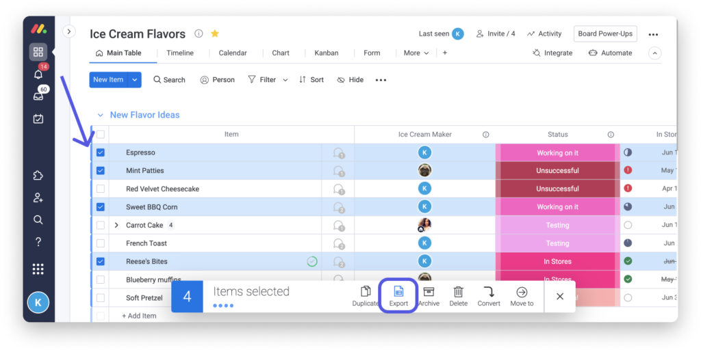 Um bestimmte Elemente zu exportieren, wählen Sie sie mithilfe der Batch-Aktionen aus. Klicken Sie dann auf "Exportieren" in der darunter angezeigten Symbolleiste für Batchaktionen.