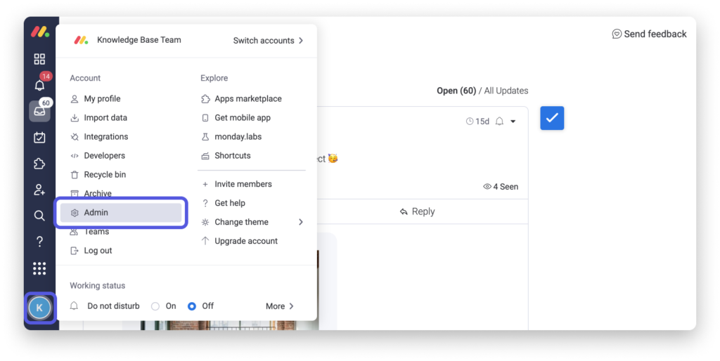 Klicken Sie zu Beginn auf Ihr Profilbild und wählen Sie "Admin".
