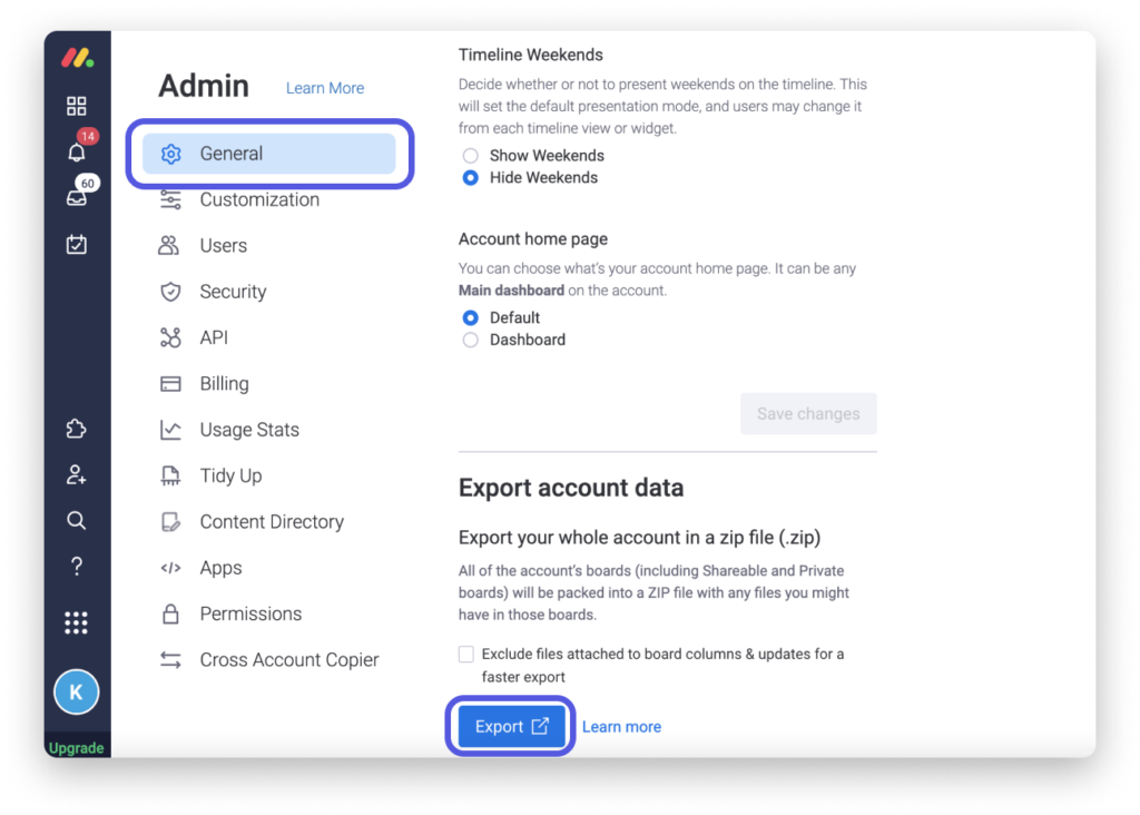 Scrollen Sie im Bereich "Admin" auf der Registerkarte "Konto" der Einstellungen "Allgemein" nach unten zum Abschnitt "Kontodaten exportieren" und klicken Sie auf "Exportieren".