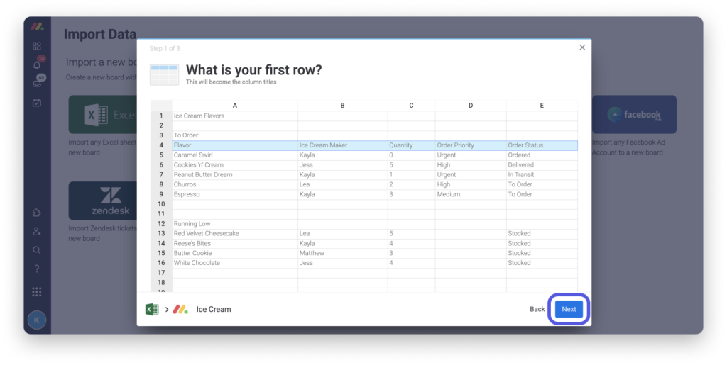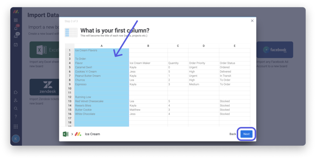 Wählen Sie dann die Spalte in Ihrem Excel-Dokument aus, die Sie als Elementname in Ihrer Monday.com-Tabelle anzeigen möchten.