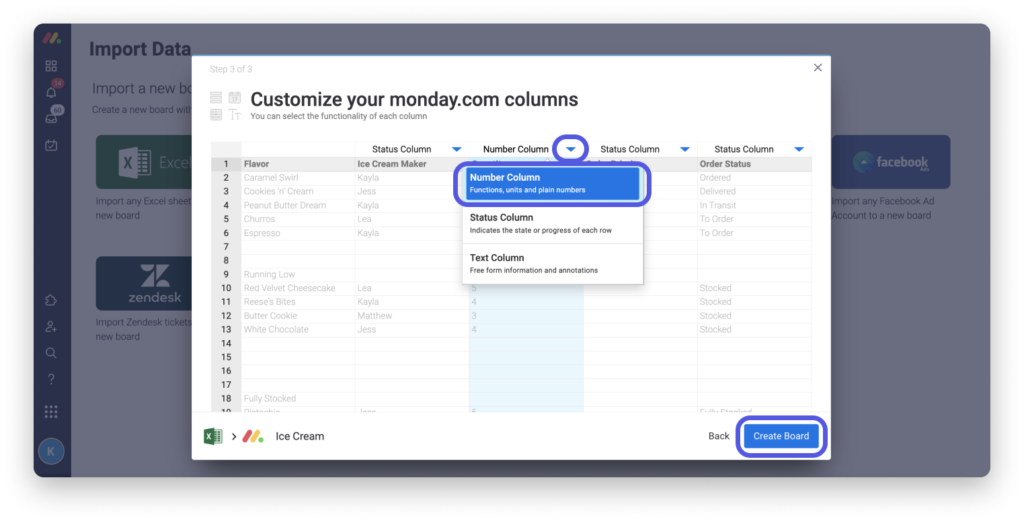 Unser System wird sein Bestes tun, um zu erraten, welche Spaltentypen Ihren Daten entsprechen, aber Sie können sie manuell ändern, indem Sie das Dropdown-Menü jeder Spalte verwenden. Sie können Spalten des Typs Zahlen, Status, E-Mail importieren, Datum oder Text. Sobald Sie die Daten importiert haben, können Sie bei Bedarf auch den Spaltentyp ändern.